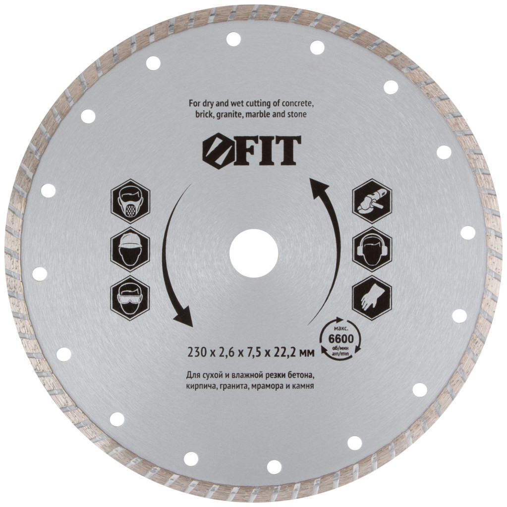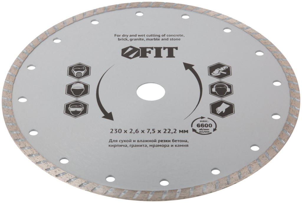 Диск отрезной алмазный «Турбо» FIT IT предназначен для сухой и влажной резки кирпича, армированного бетона, мрамора, гранита и других твердых материалов. Для использования с УШМ. Высокий рабочий ресурс дисков достигается за счет повышенной концентрации алмазного зерна в режущей кромке. Специальный турбопрофиль режущей кромки увеличивает скорость реза и способствует более эффективному удалению отработанного материала, предотвращая перегрев диска